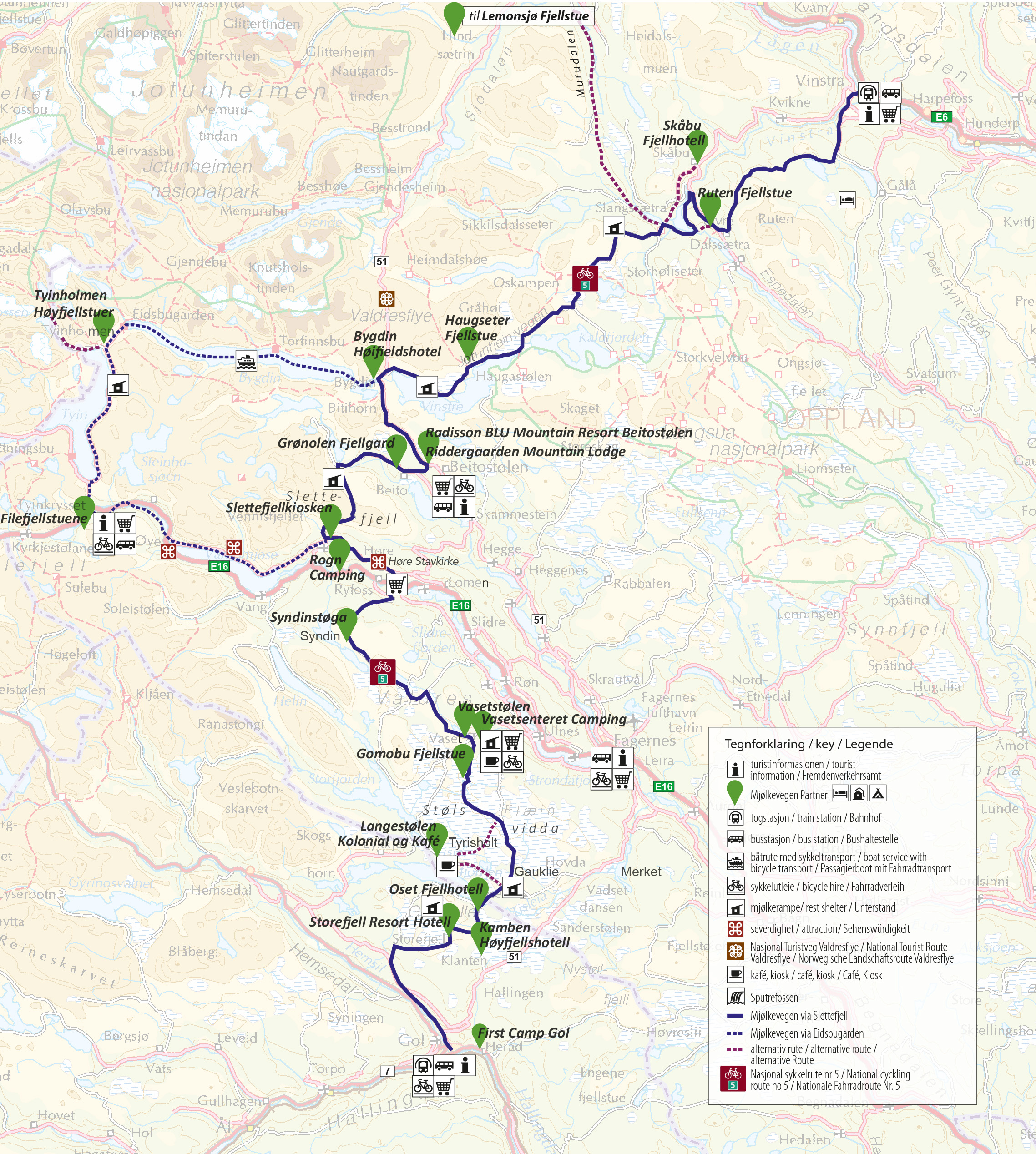 The map is obtainable from the Mjølkevegen accommodations along the southern part of the route, the tourist offices at Fagernes and Beitostølen and the Joker supermarked at Vaset.