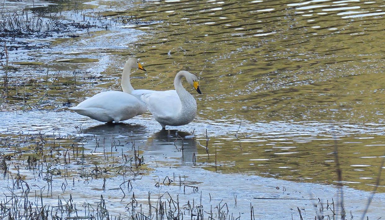 At Hunkevika at the Spikarmoen-exit along Skrautvålsvegen, some whooper swans normally are present during migration and sometimes well into winter. Common goldeneyes also can be observed in this area.