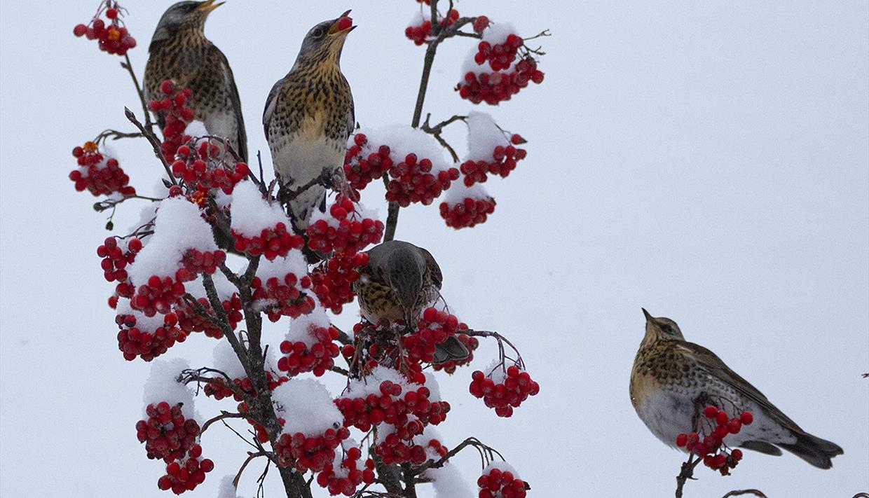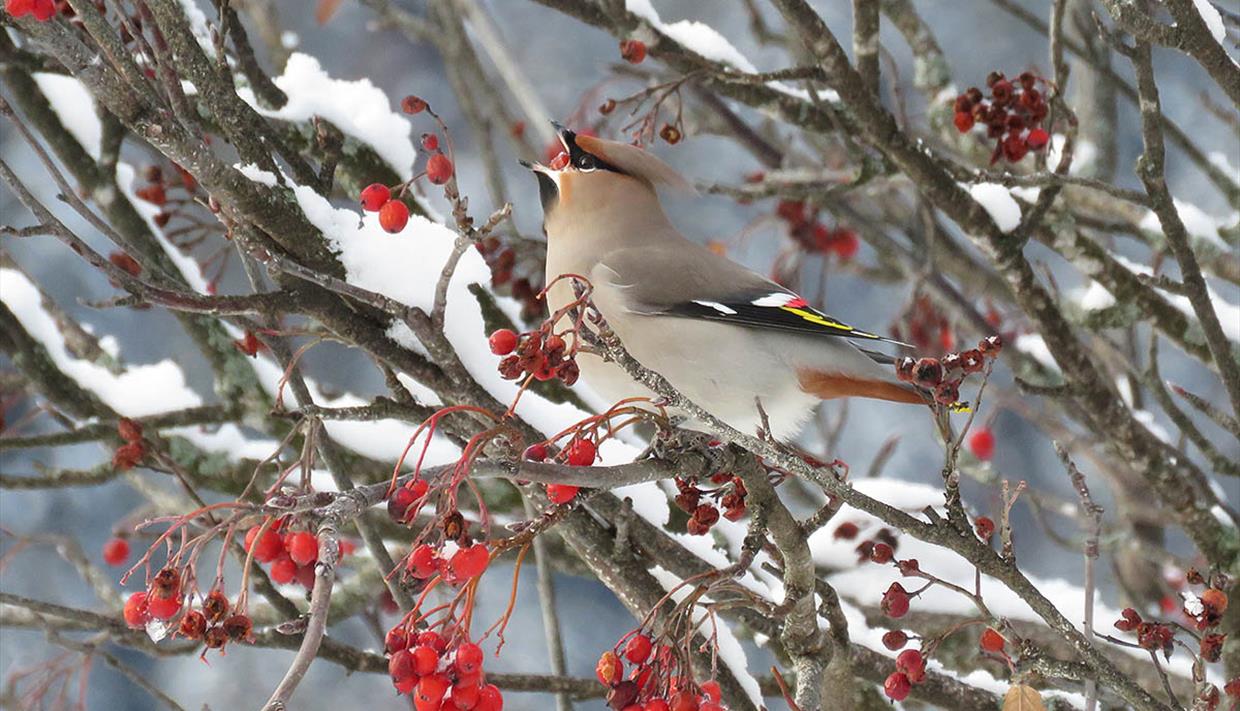 At downtown Fagernes rowanberry trees av been planted which can attract large flocks of Fieldfares and Bohemian waxwings during late fall. Waxwings tend to be annual in smaller numbers and in a short time window, but in some years with fierce winters in the arctic and when the trees carry especially many berries there can be huge flocks which stay for longer periods. They tend to roost high up in the tops of the large birch trees in front of the town hall and sweep down into the berry trees when "the air is clear" until they are flushed by cars or pedestrians and retreat into the birch tops. If you stand still next to a berry tree, you may get them within 2 meters distance.