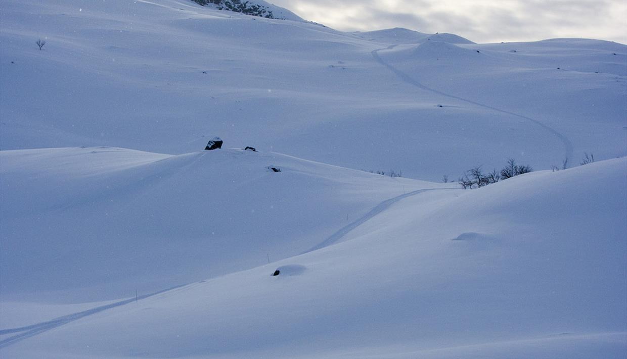 For a round trip, you can use the snow mobile track downhill to Lake Øtrovatnet and Gamlestoga. The last part of the downhill run to the lake is steep and can be rather challenging under hard snow conditions. This return is 8,2 km.
