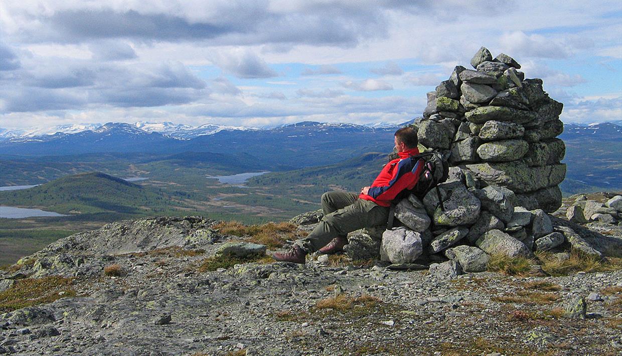 From Fagernes, follow the road to N. Etnedal and continue towards Lillehammer until approx. 2.5 km past Lenningen, where you find a rest- and parking area on the right. From here, follow the gravel road (closed for traffic) on foot to Tronhus. Here, a T-marked trail exits to the right and climbs steadily through montane forest to the open fell. A small summit called Solskiva is passed on the southern side, and approx. 500 m later an unmarked and not very clear path exits to the left. The crossing is marked with a cairn and a red T. Follow that unmarked trail to the summit of Djuptjernkampen, climbing up on its eastern shoulder. From the top, you can enjoy a far view over large parts of northern Valdres all the way to Jotunheimen.