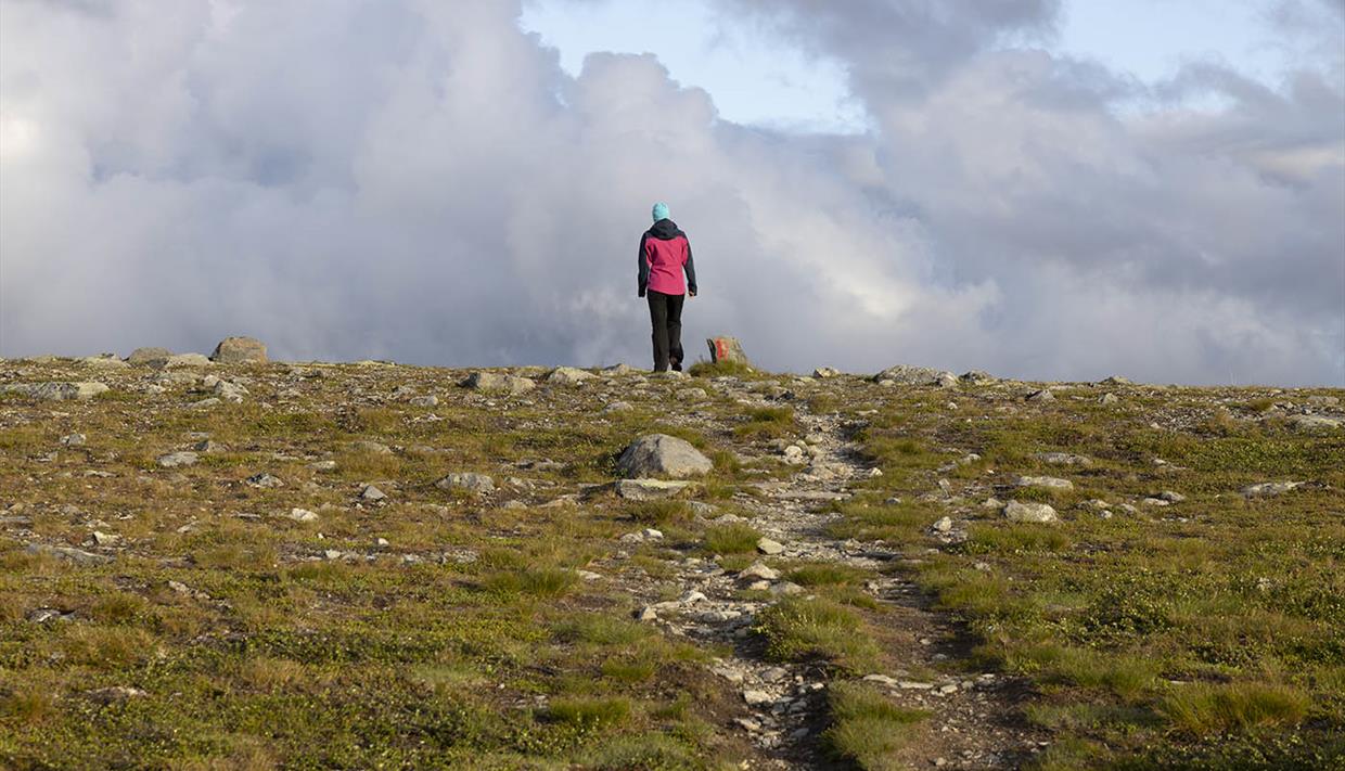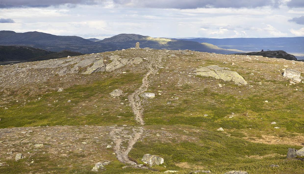 The trail starts right beside the small red hut at Båtskaret and follows the hillside to the right. After approx. 100 meters in elevation gain it flattens and shortly after the trail splits. While the trail straight ahead leads to the summit of Gravolskampen, you turn right towards Heklefjell. After approx. 10 minutes you are at the viewpoint on Heklefjellet. Continue straight ahead, over some hills and through some dumps until you get to the foot of the mountain Grønekinnkampen. Here you meet the trail net of Beitostølen where all intersections are numbered. You are now at no. 42.