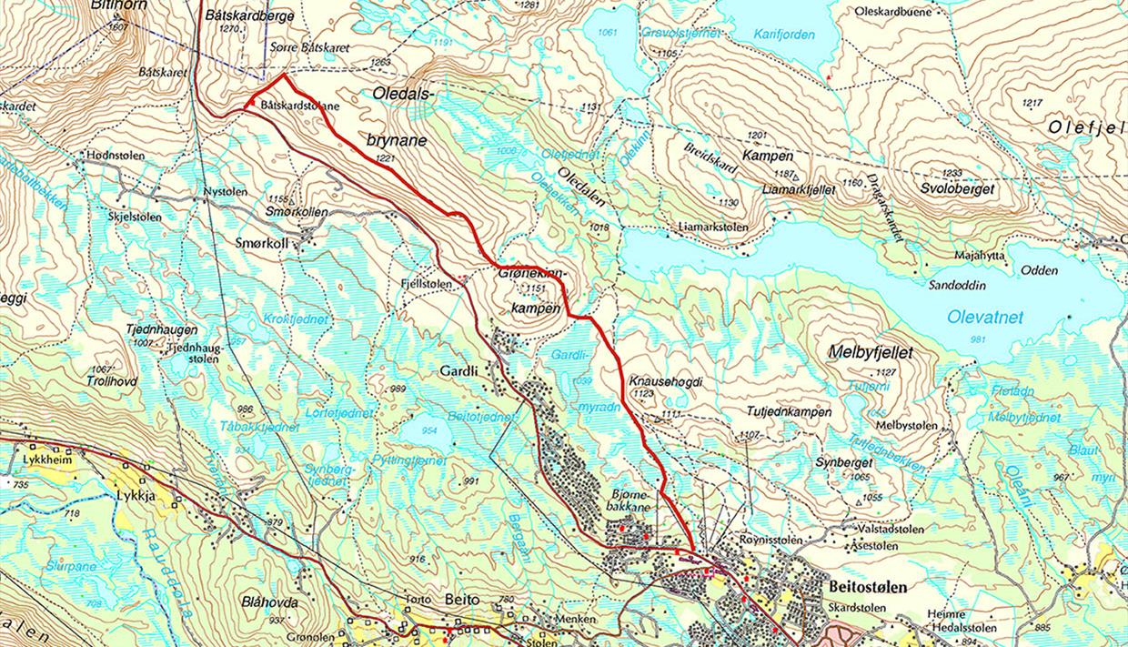 Take the bus from Beitostølen to Båtskaret (summer service; departures are found on www.nor-way.no and www.entur.no).