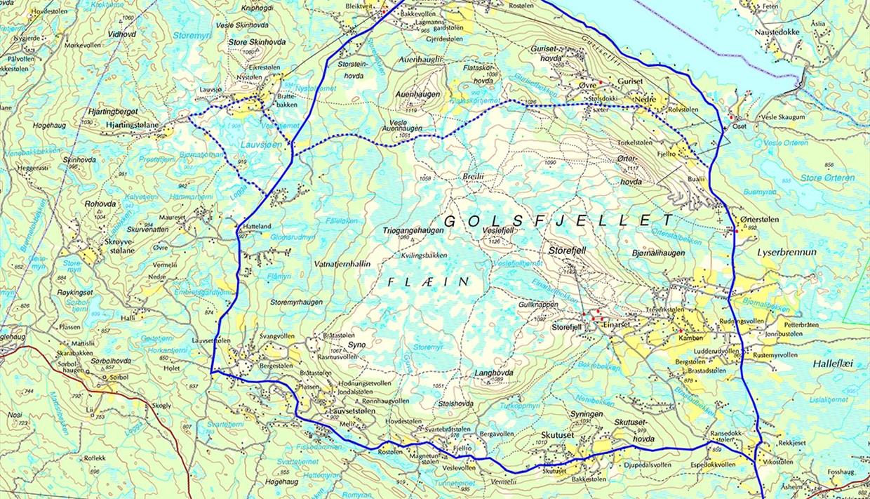 From Fjellheim, you cycle north on Golsfjellveien and turn left after approx. 1 km, slightly uphill towards Storefjell. After another km (900 m to be precise), turn left and continue steeper uphill to Skutuset. Enjoy the wildflower pastures and lovely farm surroundings at Skutuset as well as the stunning view towards the mountains in the Hallingdal region. Continue on this road with uphills and downhills. As you make you way westwards, you may see all the way to Hallingskarvet. You pass the small lake Fiskedammen and reach Lauvset.