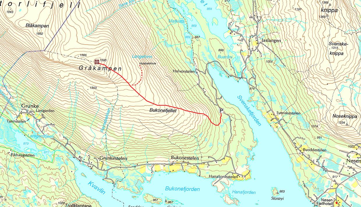 In the start the trail is fairly steep before the terrain evens out a bit more on Bukonofjellet, yet it is uphill all the way. Between approx. 1200 and 1350 m.a.s.l. there are some sheep tracks that may make it difficult to stay on the right path. Just keep going upwards and stay in the direction northwest until you find the trail again and finally see the cairn on the top of Gråkampen. The upper parts are rocky, and you may find several animal traps (rock pits).