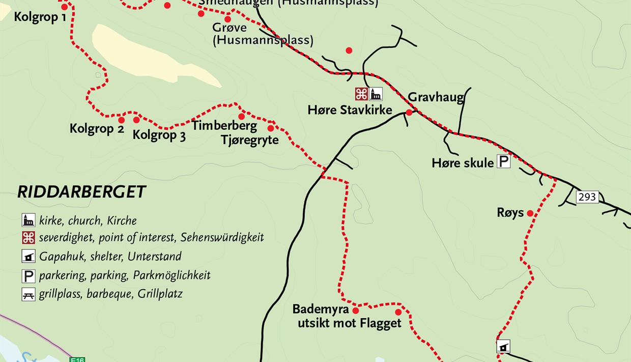 Follow the road by foot for about 700 m and you will pass by the Høre Stave Church. Keep going for another 400 m. and make a left by the main sign: “Kongevegen, Pilgrimsvegen og Kulturløype”. From here, follow the path marked “kulturløype” (culture path). When the two paths, “kulturløype” and “Kongevegen” split up, turn left. From here the culture path continues southeast and you will meet a road, Gydas veg. Turn right and follow Gydas veg for 50 m, and turn left onto a tractor road, where the culture path continues. Just below the farm, Kviishaugen, turn right and southwards. After Bademyre, turn left on the path to Riddarberget. This is one of two fortresses in Vang. There are traces of fortresses in many locations in the country, and most of them date back to the migration period (200– 400 a.d.). From Riddarberget, follow the trail downwards and to the left, and after crossing the river, you are on the walkway between Høre and Ryfoss. Turn left and keep going until you are back on road 293, where you turn left and return to the school. There are information boards along the route.