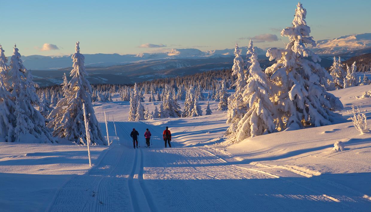 This is a round trip that can be taken in either direction. However, most people do it clockwise and that’s the way we have chosen to describe it. So, when you reach the first crossing after the first longer ascend, keep straight ahead (you will come from back on the trail to the right later). There’s another long ascend of approx. 2 km before you reach a large moor flat, Selbustølsmyrane. For another approx. 2 km, the track is quite flat and follows the moor’s left edge along the wood line. In the “Sinsenkrysset” crossing, keep to the left for another long ascend that will take you to the summit point of Skardåsen (1071 m.a.s.l.) above the tree line with a stunning wide view (keep straight ahead further uphill in the crossing approx. 500 m before the summit). Continue the round trip over the summit in rolling terrain with lots of smaller ups and downs, before a longer downhill run takes you fast to the crossing at Neverset (approx. 2 km from the summit). Keep to the right/straight ahead for another fun run downhill, before it’s flat over the moors again (this time on the opposite side). The trips ends in a long downhill run to the final crossing where you kept straight uphill in the beginning. Turn left here for the return to the ski center (4,5 km from Neverset).