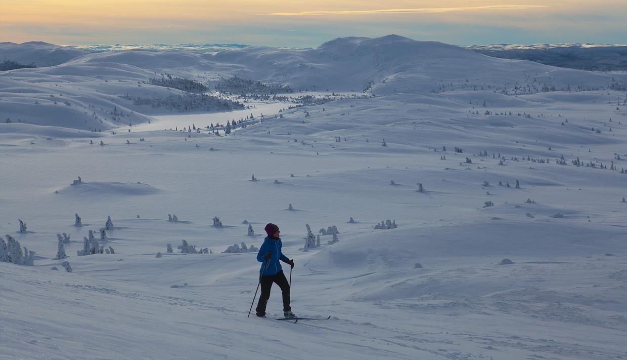 The tracks climb all the way around the mountain Smørlifjellet until you reach the highest point of the tour to the southeast of the summit. In nice weather we recommend a side trip outside the groomed tracks to the summit point (1160 m.a.s.l.).