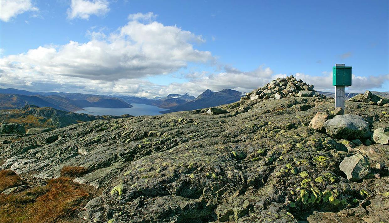 The unmarked but clear trail starts more or less right uphill on the left-hand side of the stream running downhill from the Fagerdalen valley. After an ascend of approx. 180 m, the stream is crossed on rocks and approx. 100 m after, the trail splits. To the left you enter the Fagerdalen valley, while straight ahead/right you continue uphill to the summit of Synshorn. You first reach a high point with a stunning view down to the road, Lake Bygdin and towards the mountain of Bitihorn (and most people will claim the mountain here), but the true summit lies 250-300 m further to the north. Return on the same way.